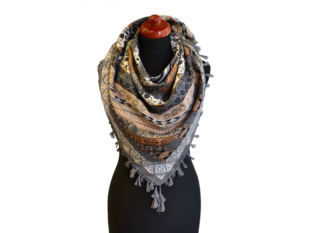 Velký maxi šátek s třásněmi je hezkou alternativou pro modní šálu - deku. Každý šátek jde uvázat na nespočet způsobů, a jeden kousek dokážete přetvořit ve více outfitech.