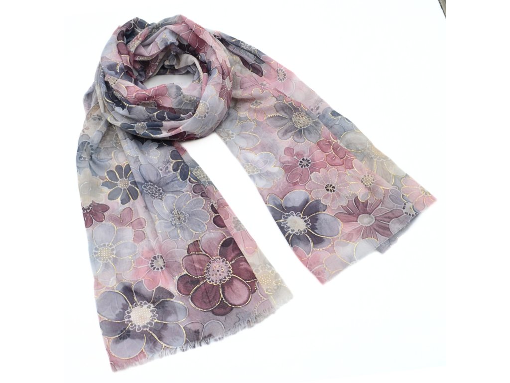 Šála klasická - šedo-růžová s květinovým vzorem