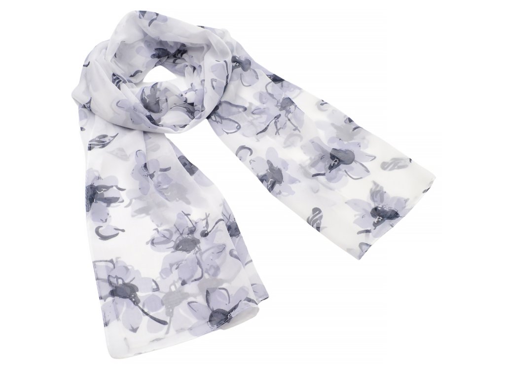 Šála vzdušná - bílá s šedým květinovým potiskem