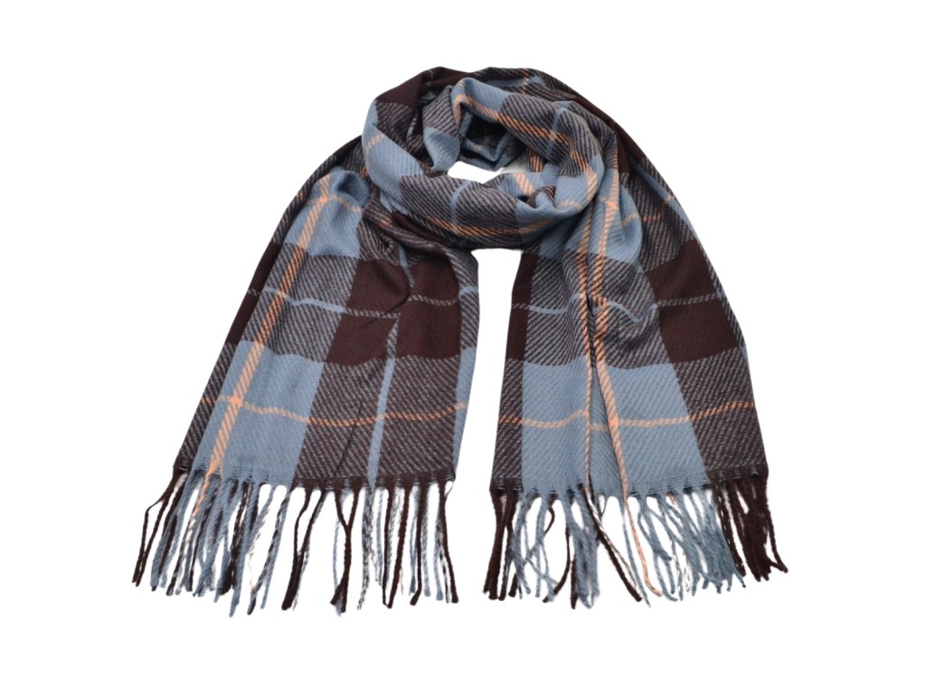 Velká teplá kostkovaná šála v modro-hnědé barvě, ideální pro chladné zimní dny. Stylová a pohodlná volba pro každodenní nošení.