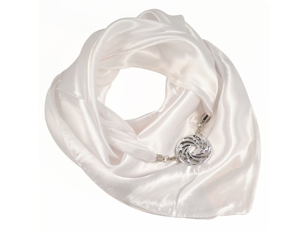 Hebký šátek s originální a zároveň elegantní ozdobou v podobě výrazného prvku uprostřed, který lze v případě potřeby snadno odepnout. Karabinkové zapínání umožňuje šátek jednoduše sepnout a vyhnout se starostem s uvazováním.