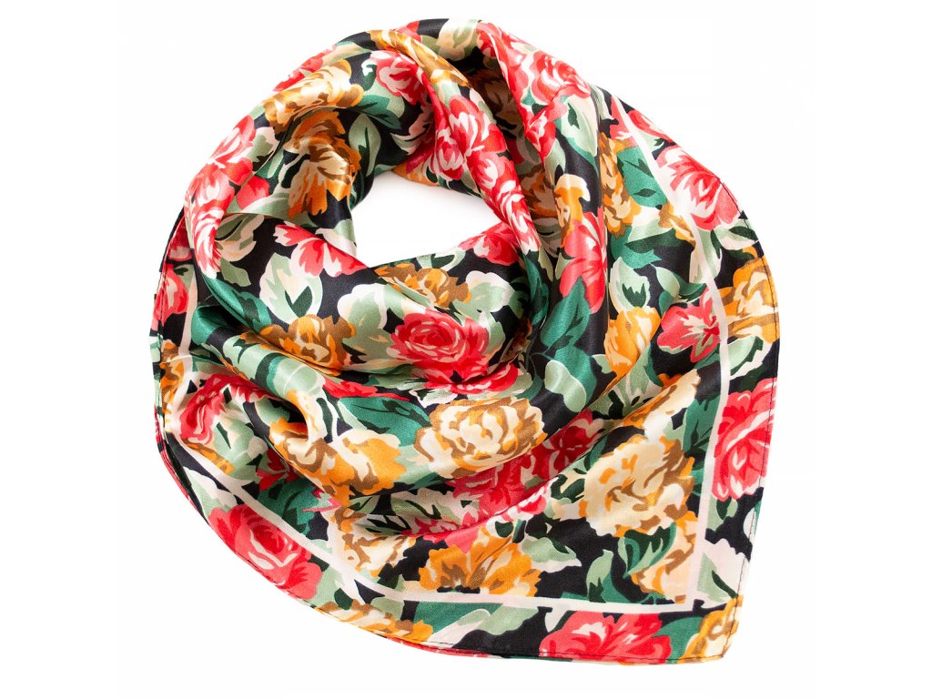 Šátek saténový - červeno-zelený s potiskem růží